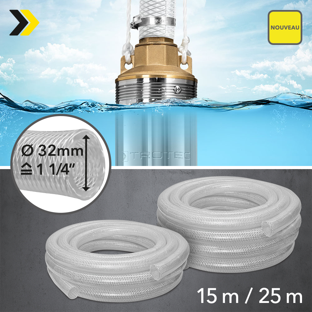 Pour tout ce qui concerne l’arrosage du jardin et l’alimentation en eau non potable, il convient de travailler avec une marque à la qualité reconnue. Cela vaut autant pour les pompes pour puits profonds et les surpresseurs domestiques que pour le choix des tuyaux d’aspiration pour l’alimentation en eau non potable. Les tuyaux de refoulement de haute qualité avec renforcement textile intégré par fibres de polyester de Trotec sont recommandés pour un grand nombre d’applications dans la maison et au jardin. Son principal atout : les tuyaux de refoulement peuvent être utilisés sans problème pour toutes les pompes habituelles avec le bon raccord d’adaptation.