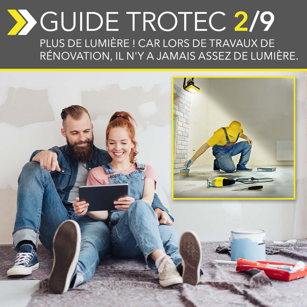 Rénover les pièces comme en plein jour, effectuer des travaux d’étanchéification à la cave avec le meilleur éclairage, avoir dehors les meilleures conditions de visibilité en extérieur, même au crépuscule ou la nuit – quel bricoleur ou artisan dirait non ? C’est pourquoi nous avons développé chez Trotec une gamme de lampes de travail qui vous procurent un éclairage optimal sur la simple pression d’un bouton. Où et quand vous le souhaitez ! Même lors de rénovations où vous devez vous passer d’un éclairage fixe, nos lampes de travail flexibles vous offrent une visibilité optimale avec une grande quantité de lumière.