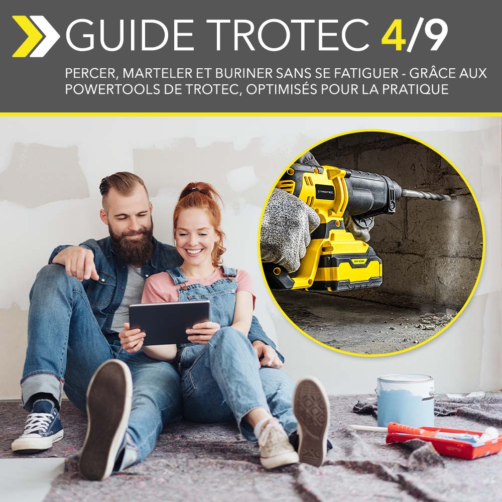 Un marteau perforateur et une perceuse à percussion – l’équipement idéal pour venir à bout de n’importe quelle tâche de rénovation. Surtout si ces deux outils sont les PowerTools éprouvés de Trotec. Le puissant marteau perforateur sans fil PRDS 10-20V vous permet de vous attaquer à des murs aussi durs que l’acier car ce concentré de puissance perce sans effort grâce à son marteau pneumatique. Et avec la perceuse à percussion compacte PHDS 10‑230V, vous exécutez aussi efficacement que rapidement tous vos travaux de perçage avec ou sans percussion et de vissage dans le bois, le béton ou l’acier. Un duo imbattable – comme son prix.