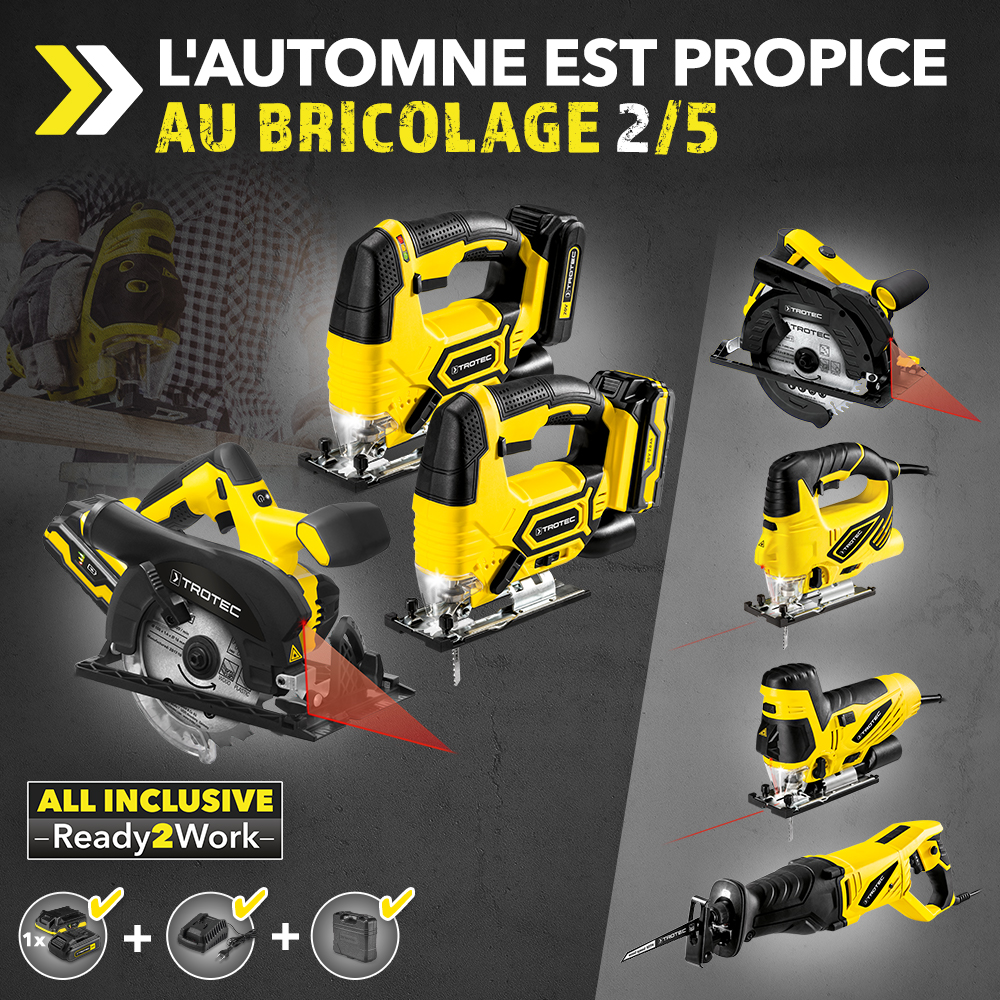 Lors de rénovations, les travaux de sciage du bois et le sciage d’autres matériaux font partie des activités les plus fréquentes. Quiconque souhaite scier se facilite le travail avec des outils électriques. Et une fois de plus, vous vous facilitez nettement la tâche en misant systématiquement sur nos PowerTools dans ce domaine également. Faites également confiance à la qualité de la marque Trotec pour notre excellente gamme de scies sauteuses, scies sabres et scies circulaires, car elle est toujours synonyme d’appareils performants et très avantageux. Car ce qui est bon n’est pas nécessairement cher.