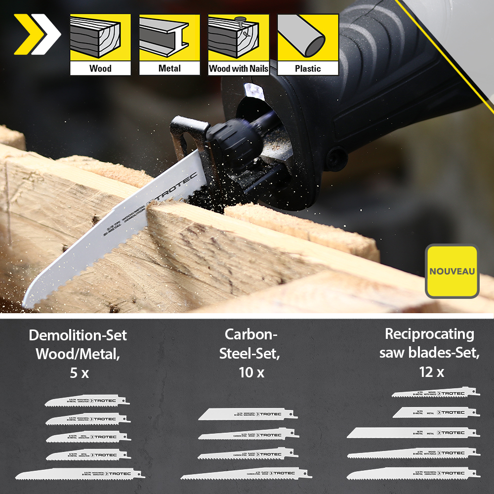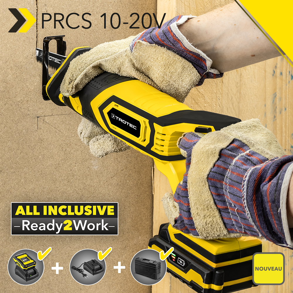 Que ce soit pour scier divers éléments et matériaux, raccourcir des tuyaux, démanteler de vieux meubles ou élaguer des arbres – tous les travaux dans la maison et le jardin peuvent être réalisés rapidement et en toute sécurité grâce aux scies sabres de grande qualité de la série PRCS de Trotec. Cette scie universelle est disponible en deux variantes : la scie PRCS 10-850 idéalement conçue avec sa tête de scie réglable en trois positions, et la puissante PRCS 10-20V sans fil, avec sa multi-batterie Flexpower 20 V/2 Ah de Trotec. Ces deux scies combinent des performances techniques probantes avec une multitude de fonctions innovantes.