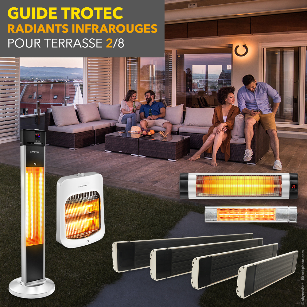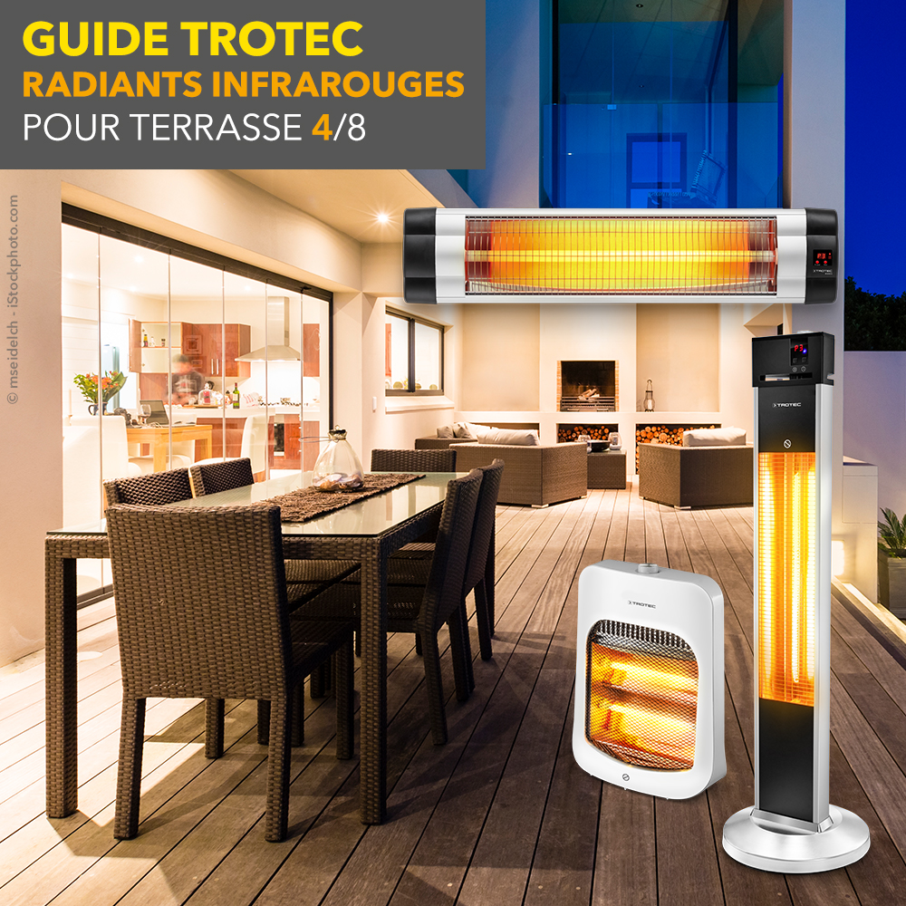 Aujourd’hui, pour le numéro 4 de notre guide Trotec « chauffages radiants infrarouge pour terrasse », nous vous présentons les deux versions offertes pour l’utilisation de chauffage radiant modernes. Il existe des chauffages radiants infrarouge muraux ou de plafond, qui permettent de gagner de la place mais ne chauffent alors qu’une zone déterminée. Vous pouvez également choisir un chauffage radiant sur pied, que vous pourrez déplacer à différents points d’utilisation, mais qui prend de la place au sol.