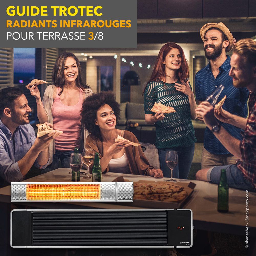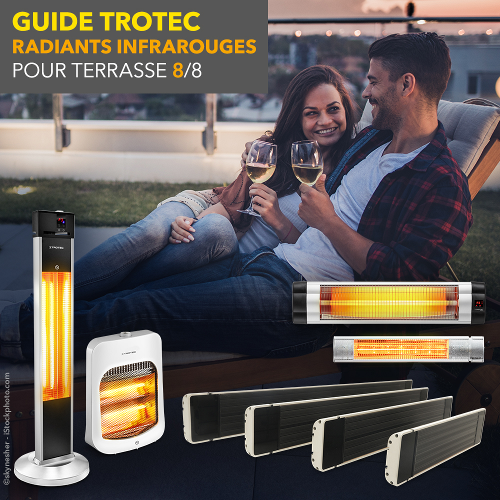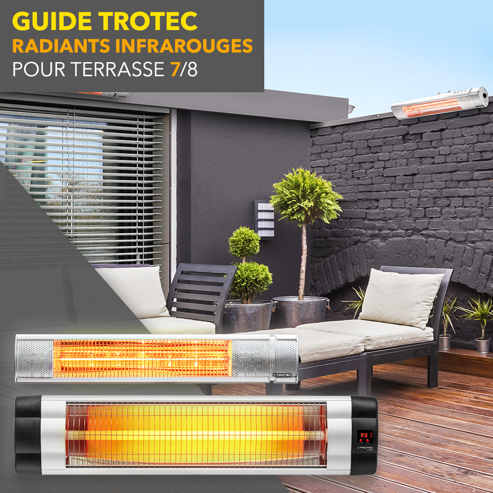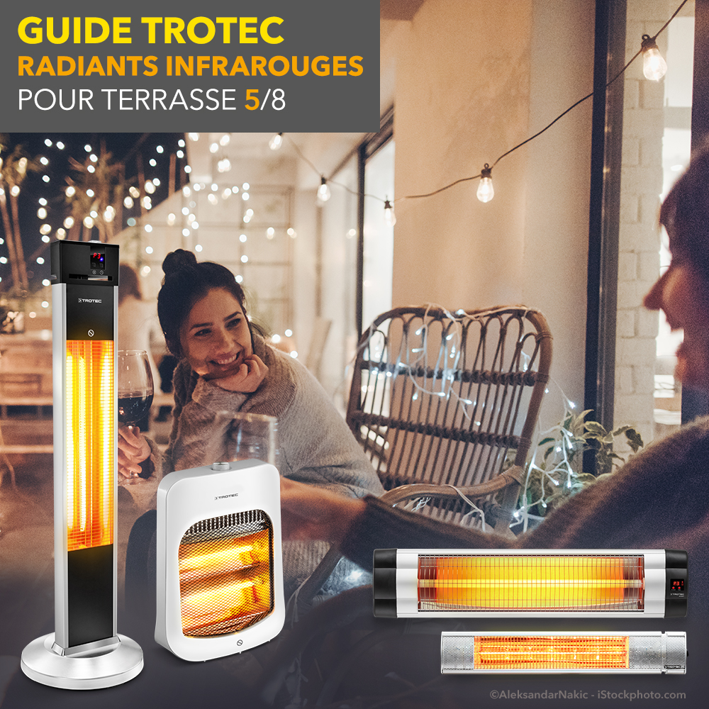 Le choix du meilleur chauffage radiant infrarouge dépend de l’utilisation que vous prévoyez de faire de l’appareil sur votre terrasse. C’est pourquoi nous avons choisi de conclure notre série du guide Trotec « chauffage radiant infrarouge pour terrasse » par une présentation de la gamme complète des chauffages radiants infrarouge Trotec. Toutes les caractéristiques importantes des chauffages radiants infrarouge d’un seul coup d’œil. De la puissance de chauffage à la surface couverte, en passant par les types de fixation, la lumière produite et la classe IP : vous êtes sûr de trouver chez nous l’appareil qu’il vous faut !