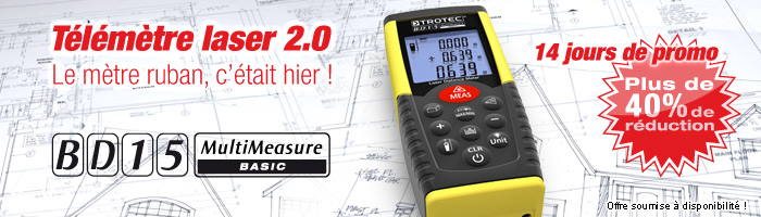 À ne pas rater ! Le télémètre professionnel BD15 est actuellement disponible à -40 %, soit à 80,35 € TTC au lieu de 142,32 €. Mais attention : l’offre n’est valable que 14 jours et dans la limite des stocks disponibles !