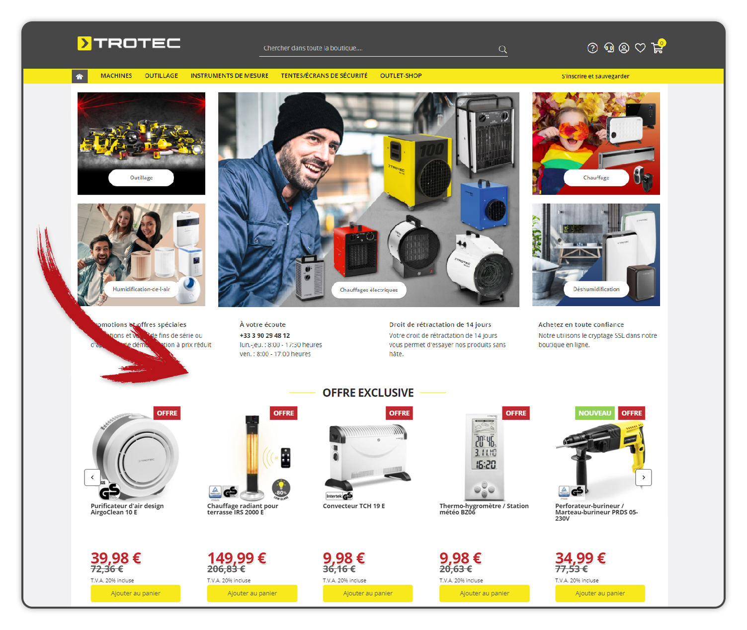CONSULTEZ NOS AFFAIRES DANS NOTRE BOUTIQUE EN LIGNE :Toutes les meilleures PROMOS s’affichent sur la page d’accueil de notre boutique en ligne fr.trotec.com/shop. Vous pouvez naviguer avec les flèches droite et gauche pour trouver toutes les affaires du moment. |