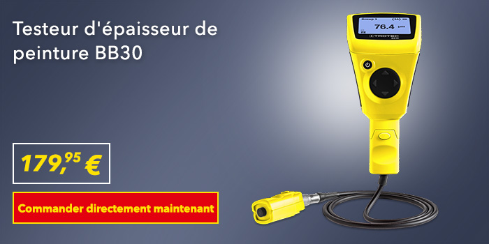 Une voiture repeinte n’est évidemment pas automatiquement une mauvaise voiture. Mais des dommages antérieurs sur le véhicule sont toujours un bon argument pour baisser le prix lors de négociations de vente. Les 89,95 € du testeur d’épaisseur de peinture BB20 sont donc vite rentabilisés.
