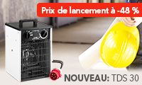 La série d’aérothermes électriques de chantier TDS s’est agrandie d’un modèle de 5,5 kW. Le chauffage électrique professionnel TDS 30 génère une chaleur propre et immédiate, sans condensation ni fumées de combustion. Parfait pour le chauffage des ateliers, pour accélérer le séchage de nouvelles plâtreries ou pour le hors-gel par exemple.