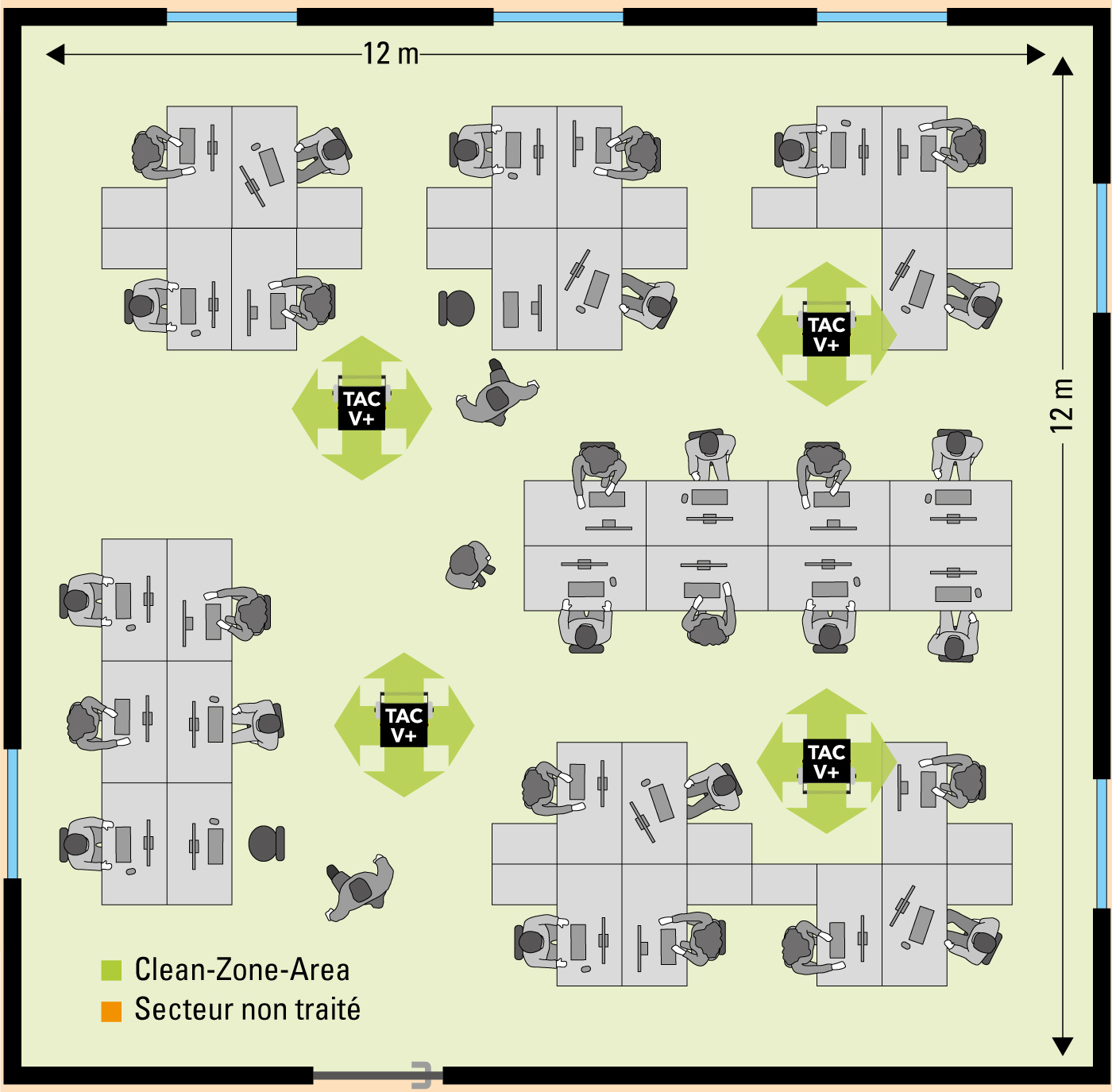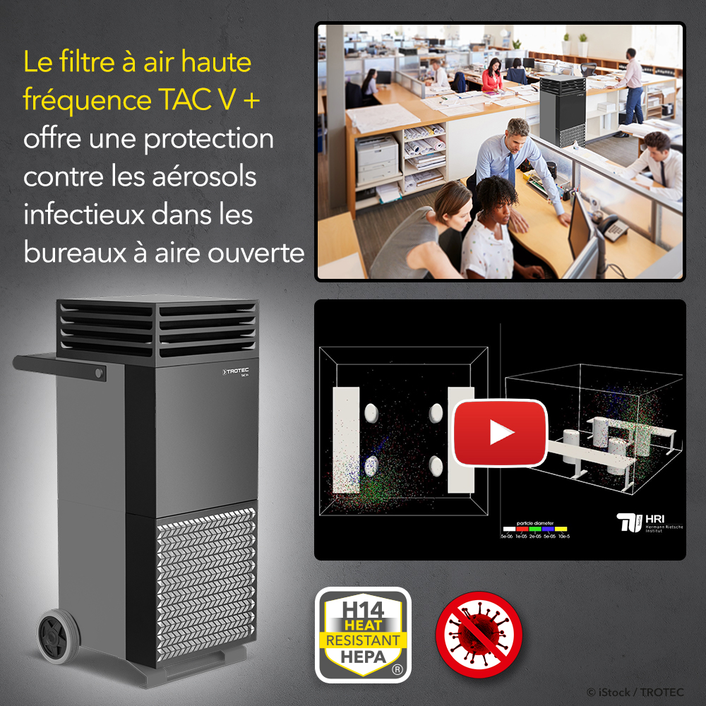 Les règles de distanciation, les masques ainsi que des cycles de nettoyage et de désinfection renforcés sont tous – pris séparément – des mesures pleines de sens ! Néanmoins, ces mesures n’offrent aucune protection contre les particules infectieuses en suspension dans l’air, qui peuvent s’élever parfois, comme de la fumée, de plusieurs mètres, avant de retomber lentement sur une large surface au sol après plusieurs heures, même derrière des écrans de protection prétendument sûrs contre les postillons. Grâce à l’utilisation d’un purificateur d’air TAC V+ avec filtre à virus, le risque que les salariés soient infectés par le coronavirus via l’air ambiant malgré le respect de toutes les règles de sécurité et d’hygiène est presque nul !
