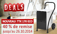 Ce déshumidificateur de chantier compact sera disponible fin octobre/début novembre. En le réservant dès maintenant, vous profiterez d’une remise de 40 % sur le prix catalogue de 445 € HT. Attention, cette offre spéciale n’est valable que jusqu’au 26 octobre. Pour voir l’appareil dans la boutique Trotec et commander le TTK 170 ECO à 265,29 € HT au lieu de 445 € HT, cliquez ici.