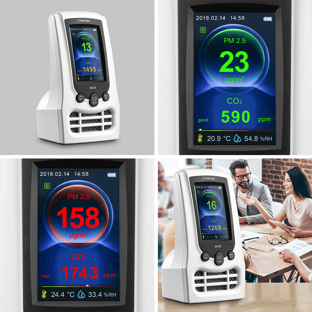 Le moniteur de qualité de l’air pratique BQ30 permet aux employeurs de surveiller avec fiabilité la qualité de l’air. Le BQ30 mesure la concentration en CO2 dans l’air ambiant et indique la valeur mesurée de façon lisible sur l’écran LCD. L’appareil de mesure pratique évalue également la quantité de particules fines de poussière présentes dans l’air ambiant et signale immédiatement les concentrations dangereusement élevées. Pour cela, l’appareil de mesure capture sans problème, par technologie laser, les plus petites particules de pollution de l’air, de taille PM2.5 et PM10 en microgramme par mètre cube.