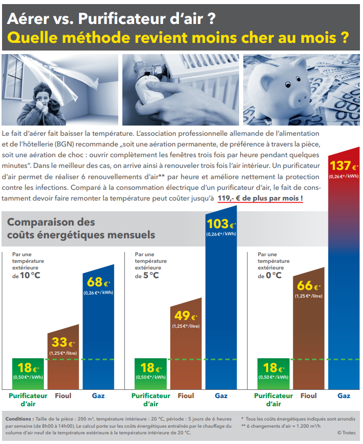 Les purificateurs d’air mobiles Trotec fournissent une solution nettement plus efficace pour éviter les infections Corona en automne et en hiver, tout en réduisant les coûts énergétiques. Les coûts d’exploitation des purificateurs d’air sont ainsi amortis en très peu de temps par les économies de chauffage réalisées.