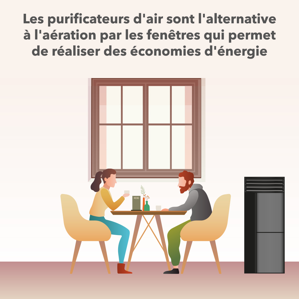 L’utilisation de purificateurs d’air mobiles refroidit moins les espaces intérieurs, car les temps d’aération sont sensiblement réduits et les intervalles d’aération nettement prolongés. En d’autres termes, il est à nouveau possible d’aérer comme on le faisait avant l’ère Corona. Cela permet d’atténuer la forte augmentation des coûts de chauffage qui résulte inévitablement d’une aération sans purification de l’air.