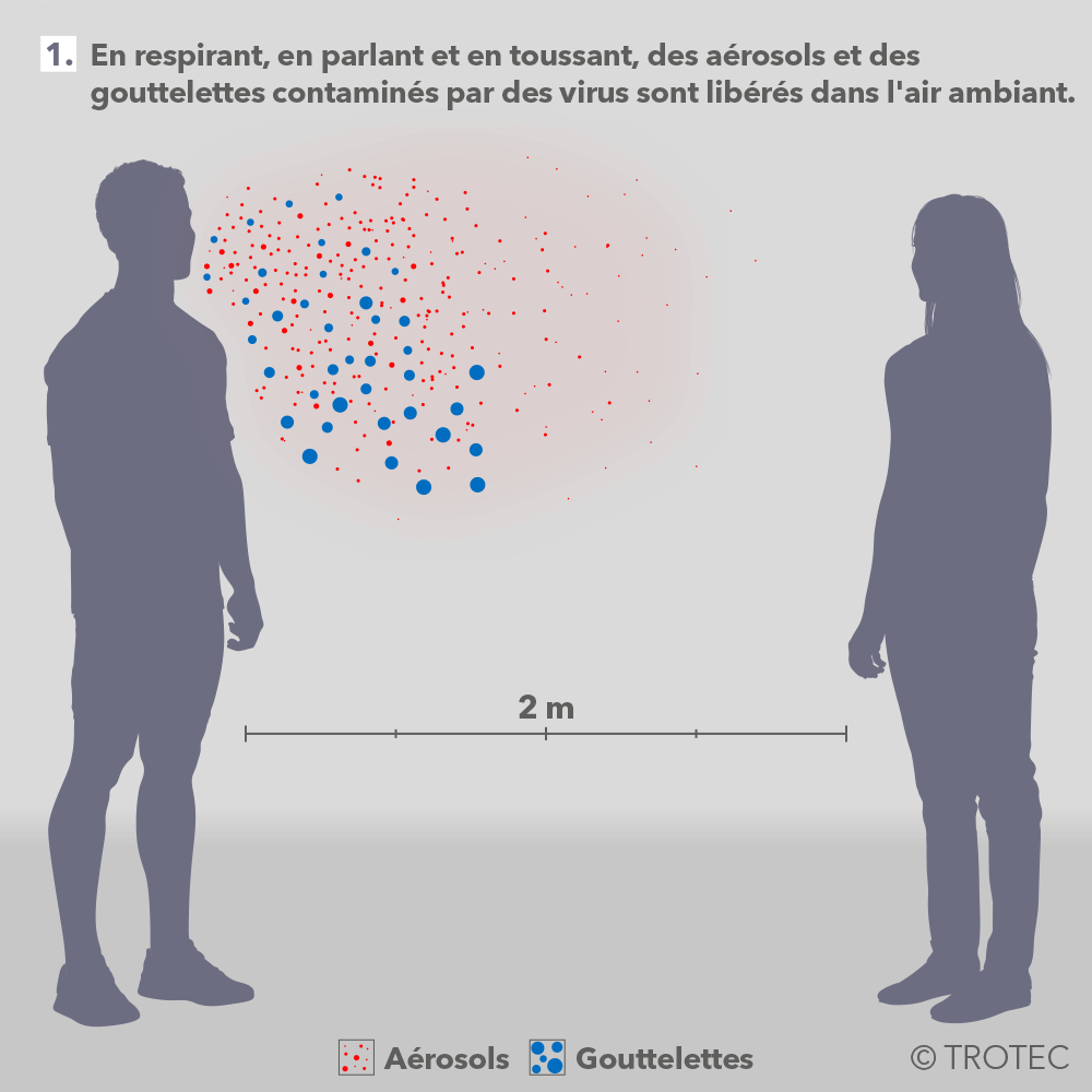 Presque toutes les mesures qui sont recommandées protègent certes d’une infection par contact ou par gouttelettes, mais aucun parmi les nombreux concepts de sécurité et d’hygiène ne mentionne des recommandations pratiques en matière de protection contre l’inhalation, dans des pièces fermées, d’aérosols infectieux qui permettent la pénétration du virus par les voies respiratoires. Il existe pourtant également une mesure de protection efficace contre cette voie d’infection.