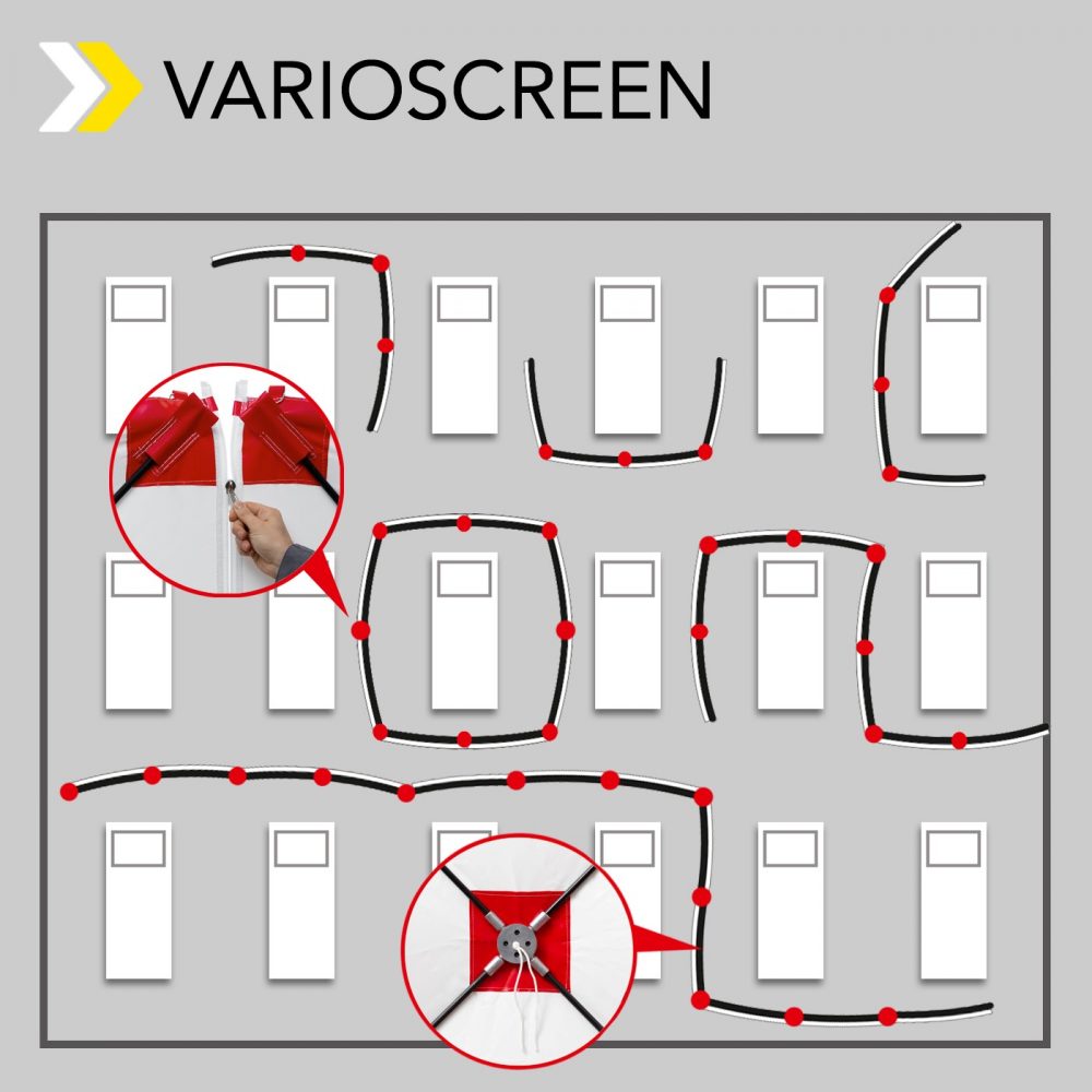 Afin de mettre un écran autour de grands espaces, il est possible de raccorder rapidement et facilement plusieurs écrans brise-vue par des fermetures éclair (longueur standard de 7,20 m). Cette fonctionnalité permet d’étendre presque sans limite la protection contre les regards ou la cloison de séparation. Trois points d’articulation par module rendent un maximum de flexibilité pour le montage. L’écran brise-vue peut être installé en demi-cercle, en zigzag ou comme cloison carrée classique. Il est possible de changer la configuration en quelques secondes à peine.