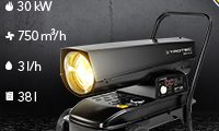Commandez dès aujourd’hui le chauffage au fioul IDX 31 D etprofitez de notre offre actuelle pour seulement 199,96 € au lieu de 383,14 € TVA incl.– disponible dès maintenant dans la boutique Trotec !