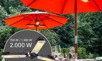 Le design bien pensé du nouveau chauffage radiant pour parasol IR 2005 SC convainc en termes d’esthétique, de fonctionnalité et de sécurité ; sans nécessiter de place supplémentaire. Le chauffage radiant pour parasol, fabriqué en aluminium résistant aux intempéries et protégé contre les projections d’eau selon l’indice IP34, se monte en un tournemain sur le mât du parasol (adapté pour des diamètres allant de 2,5 cm à 6 cm). Vous pouvez ajuster individuellement l’intensité de la chaleur grâce à trois niveaux de chauffage de 700 watts, 1 300 watts et 2 000 watts que vous réglez à l’aide de deux interrupteurs à bascule présents sur le chauffage radiant pour parasol. Avec son design esthétique en hélice, avec des bras chauffants réglables verticalement à 90°, il peut être plié et déplié en continu et garantit une chaleur intense à 360° dans toutes les directions.
