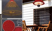 D’un poids de 2,5 kg seulement, le chauffage radiant suspendu IR 1510 SC peut être facilement accroché au plafond, aux auvents de terrasses ou aux structures de tentes grâce à la chaîne en acier inoxydable de 50 cm fournie dans la livraison, sans l’assistance d’un technicien et sans occuper trop de place. Une grille de protection aux mailles fines empêche petits et grands de toucher aux tubes chauffants, par curiosité ou par accident. Le raccordement électrique s’effectue sans montage via un câble électrique de 1,85 m de long avec fiche Schuko (CEE 7/7) pour les prises européennes.