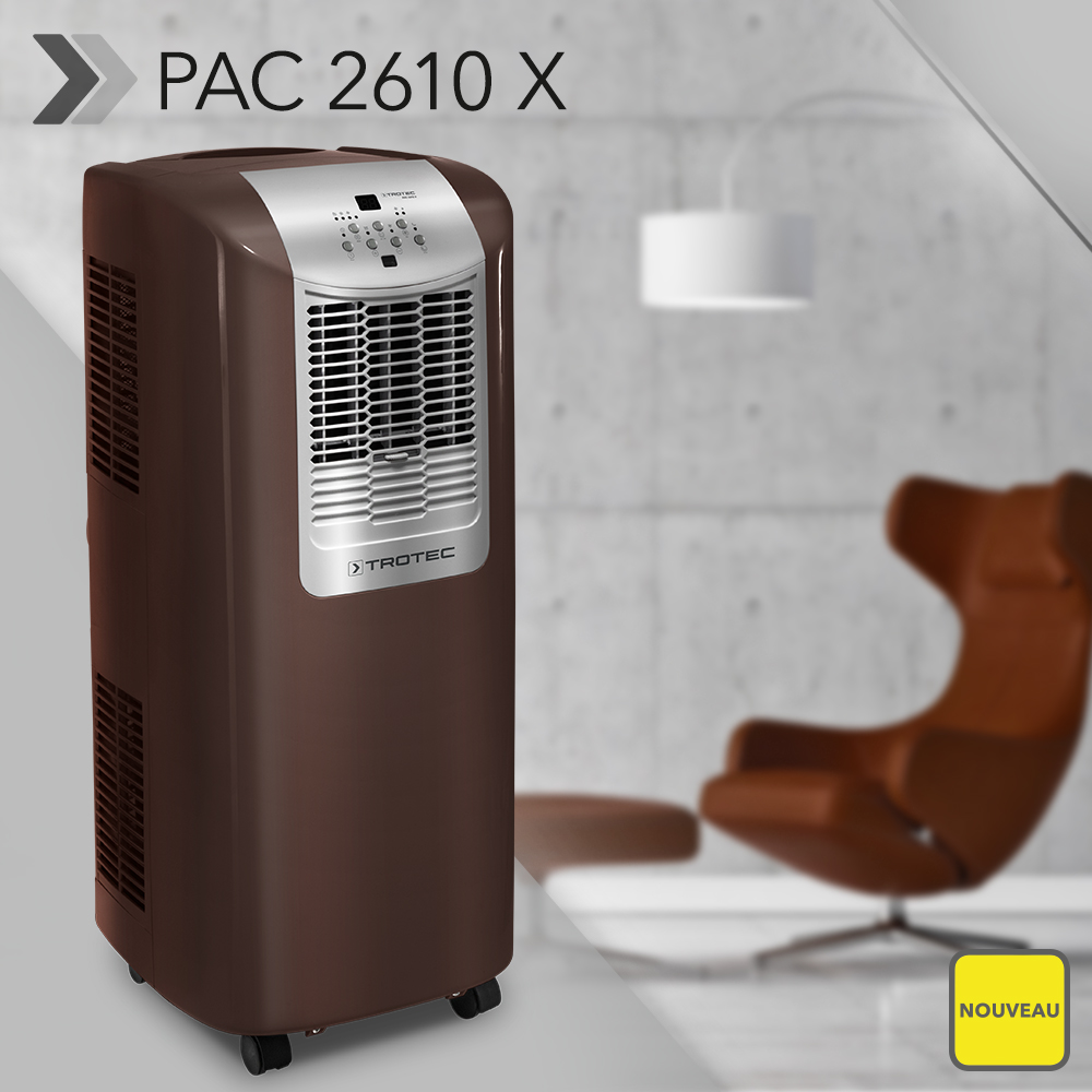 Est-ce son design hyper-cool couleur marron chocolat et argent ? Sa grande puissance frigorifique de 2,6 kW qui ne laisse personne indifférent ? Ou encore son prix incroyablement avantageux vous permettant d’économiser 180,00 € ? Peu importe la raison, le nouveau climatiseur PAC 2610 X a déjà l’étoffe d’un bestseller depuis son apparition il y a quelques jours dans la boutique Trotec. Vous êtes peut-être à la recherche d’un rafraîchissement élégant pour les chaleurs des prochaines semaines ?  Il serait alors indécent d’hésiter plus longtemps…