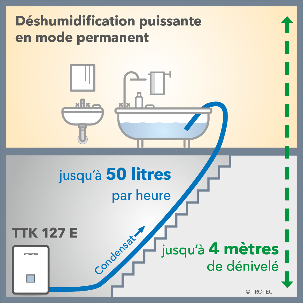 Il est bien connu qu’éliminer de grandes quantités d’humidité dans des pièces à l’aide d’un déshumidificateur ne va pas sans vider inlassablement le réservoir d’eau. L’utilisation du déshumidificateur confort professionnel TTK 127 E abolit désormais cette théorie puisque ce concentré de puissance, capable d’éliminer jusqu’à 50 litres d’humidité par jour, est équipé d’une puissante pompe à condensat intégrée. Celle-ci vous permet d’évacuer automatiquement l’eau accumulée et ce, jusqu’à 50 litres d’eau en 24 heures ! De la manière la plus simple qui soit, en appuyant sur un bouton !