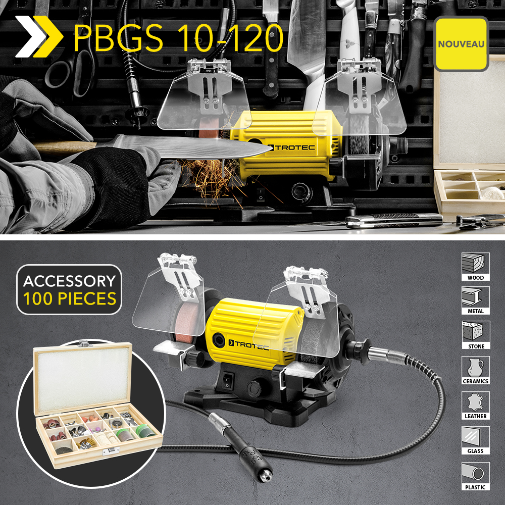 Vous recevez la ponceuse double PBGS 10-120 avec 1 x disque de ponçage Ø 75 mm K120, 1 x disque de polissage Ø 75 mm K400, un arbre flexible outils de rotation (1 m) et un kit d’accessoires de 100 pièces dans une boîte de rangement en bois très pratique.