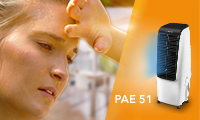 La chaleur réduit nos capacités physiques et mentales la journée et perturbe notre sommeil la nuit. C’est pourquoi nous vous proposons le nouveau refroidisseur d’air PAE 51 : cet appareil offre un rafraichissement instantané et agréable de l’air pour transformer les espaces de vie et les bureaux trop chauds en véritables oasis de climat tempéré. Avec une capacité d’évaporation de 2 litres/heure et un débit d’air de 661 m3/h, le refroidisseur est idéal pour toutes les pièces jusqu’à 150 m3. Le meilleur : un fonctionnement ultra simple sans nécessiter de liquide de refroidissement artificiel, de montage complexe ou de tuyaux d’évacuation gênants. Ceux pour qui les chiffres importent sauront apprécier la faible consommation d’énergie de 100 watt et par conséquent, les économies générées.