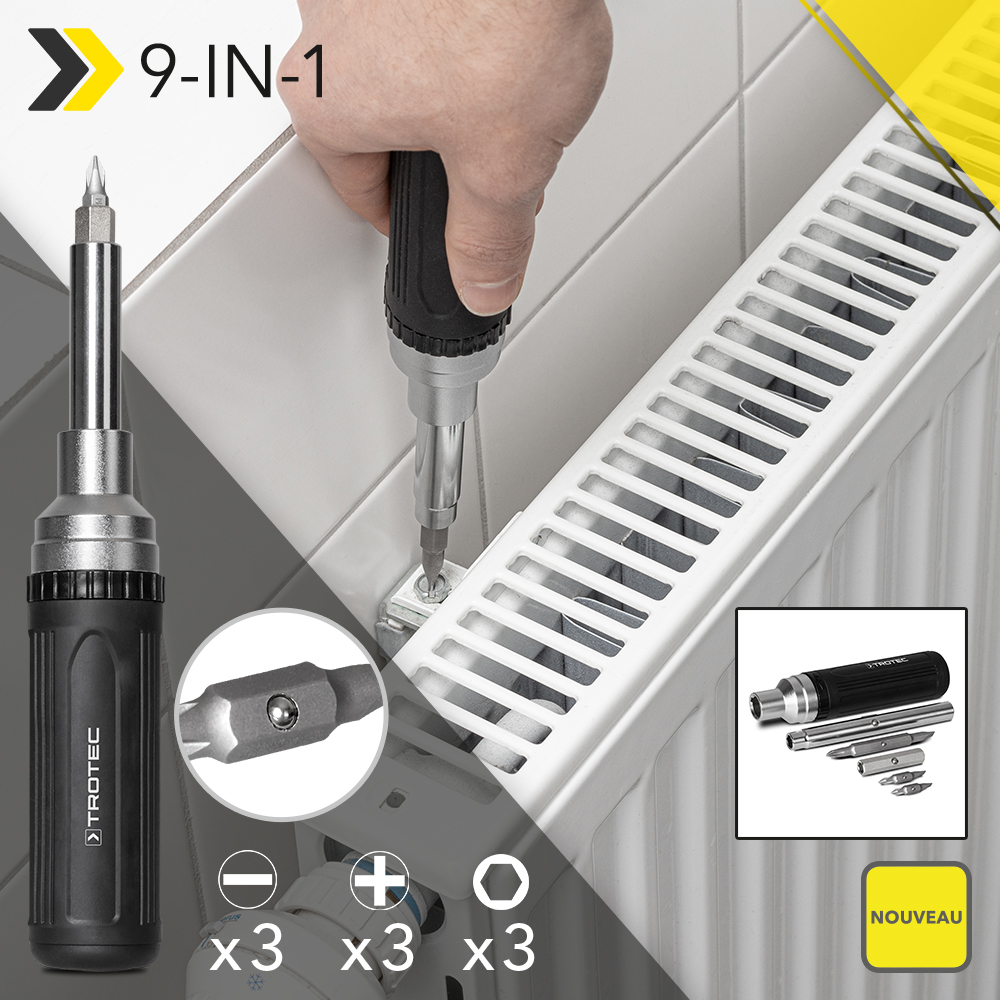 Commandez dès aujourd’hui le nouveau tournevis à cliquet 9 en 1 incluant 6 embouts et 3 porte-embouts et profitez de notre offre actuelle pour seulement 9,95 € au lieu de 30,19 € TVA incl. – disponible dès maintenant dans la boutique Trotec !