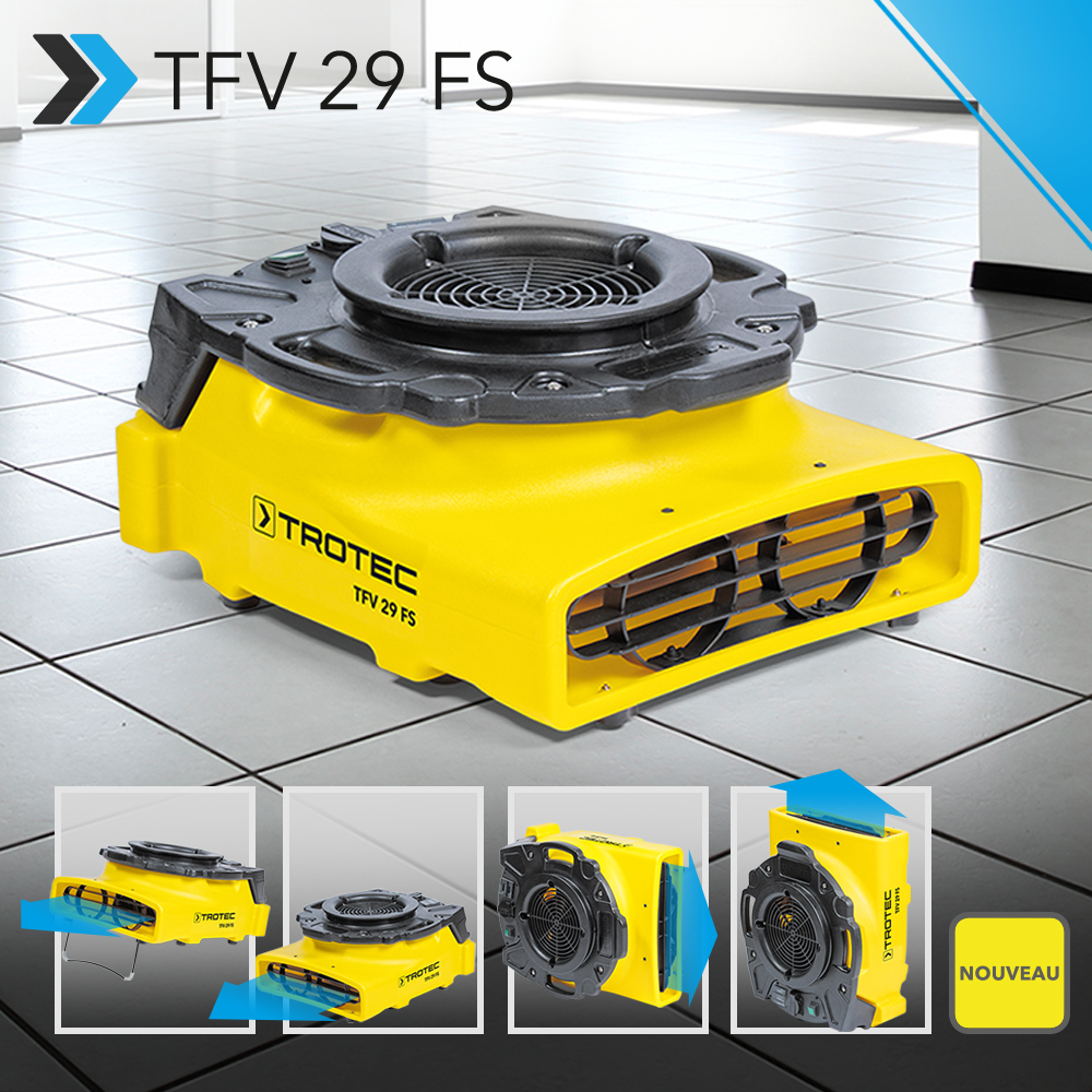 Les durées de séchage courtes jouent un rôle décisif dans le domaine de la construction et de l’assainissement : elles permettent non seulement au prochain corps de métier de commencer le plus tôt possible mais en plus d’économiser grâce au gain de temps. Pour cette raison, la construction judicieuse du nouveau ventilateur de surface TFV 29 FS, avec ses pales métalliques robustes de forme optimale, permet un débit d’air particulièrement élevé : les durées de séchage sont sensiblement réduites avec néanmoins une pression maximale et une hauteur de construction minimale.