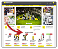 COMMENT TROUVER VOS OFFRES DANS LA BOUTIQUE EN LIGNE:Tous les « TOP DEALS » sont affichés sur notre page d’accueil dans la boutique en ligne fr.trotec.com/shop. Naviguez simplement avec les flèches vers la « droite » et la « gauche » et vous trouverez toutes les offres en cours. |