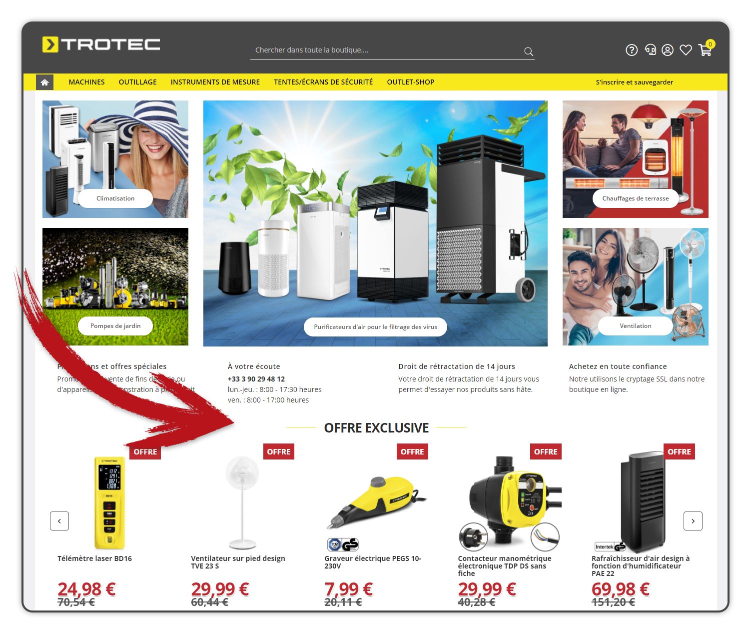 Tous les « TOP DEALS » sont affichés sur notre page d’accueil dans la boutique en ligne fr.trotec.com/shop. Naviguez simplement avec les flèches vers la « droite » et la « gauche » et vous trouverez toutes les offres en cours.