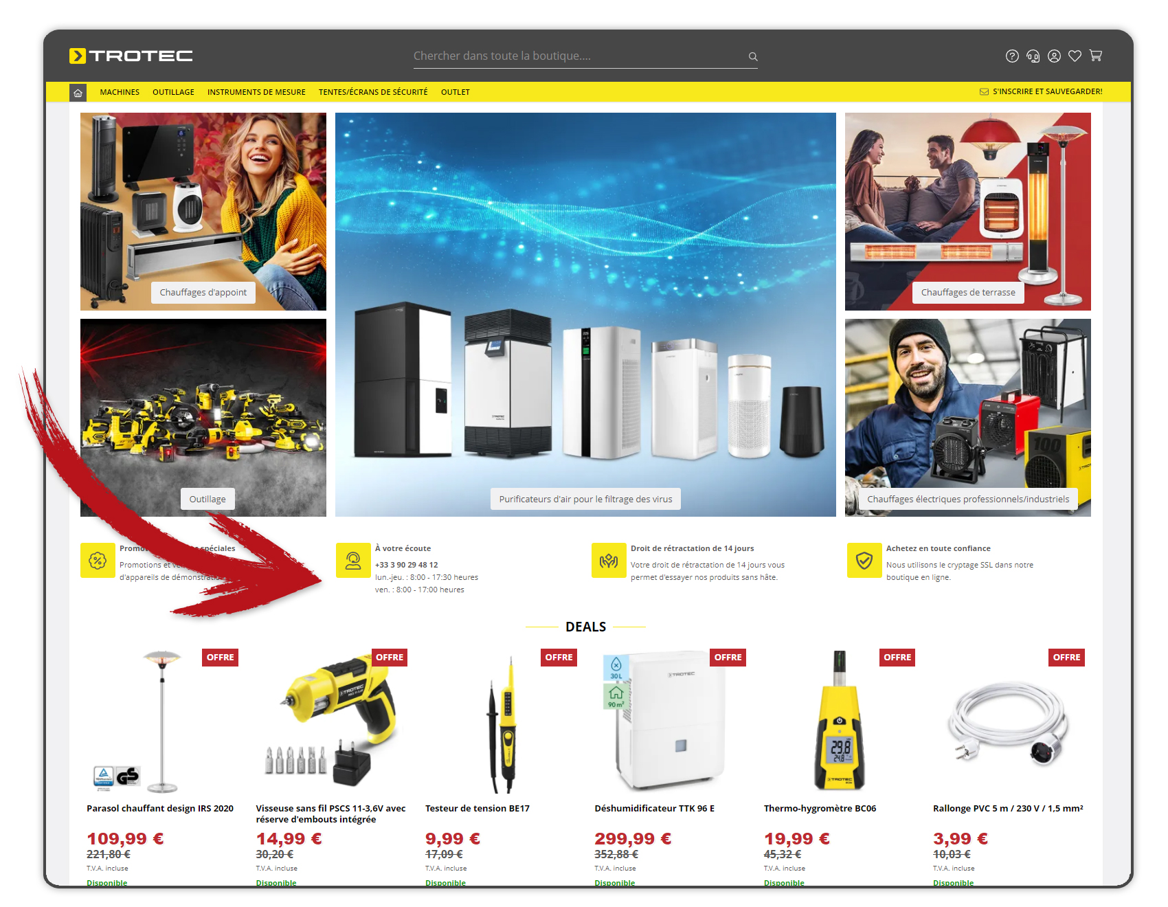 Tous les « TOP DEALS » sont affichés sur notre page d’accueil dans la boutique en ligne fr.trotec.com/shop. Naviguez simplement avec les flèches vers la « droite » et la « gauche » et vous trouverez toutes les offres en cours.
