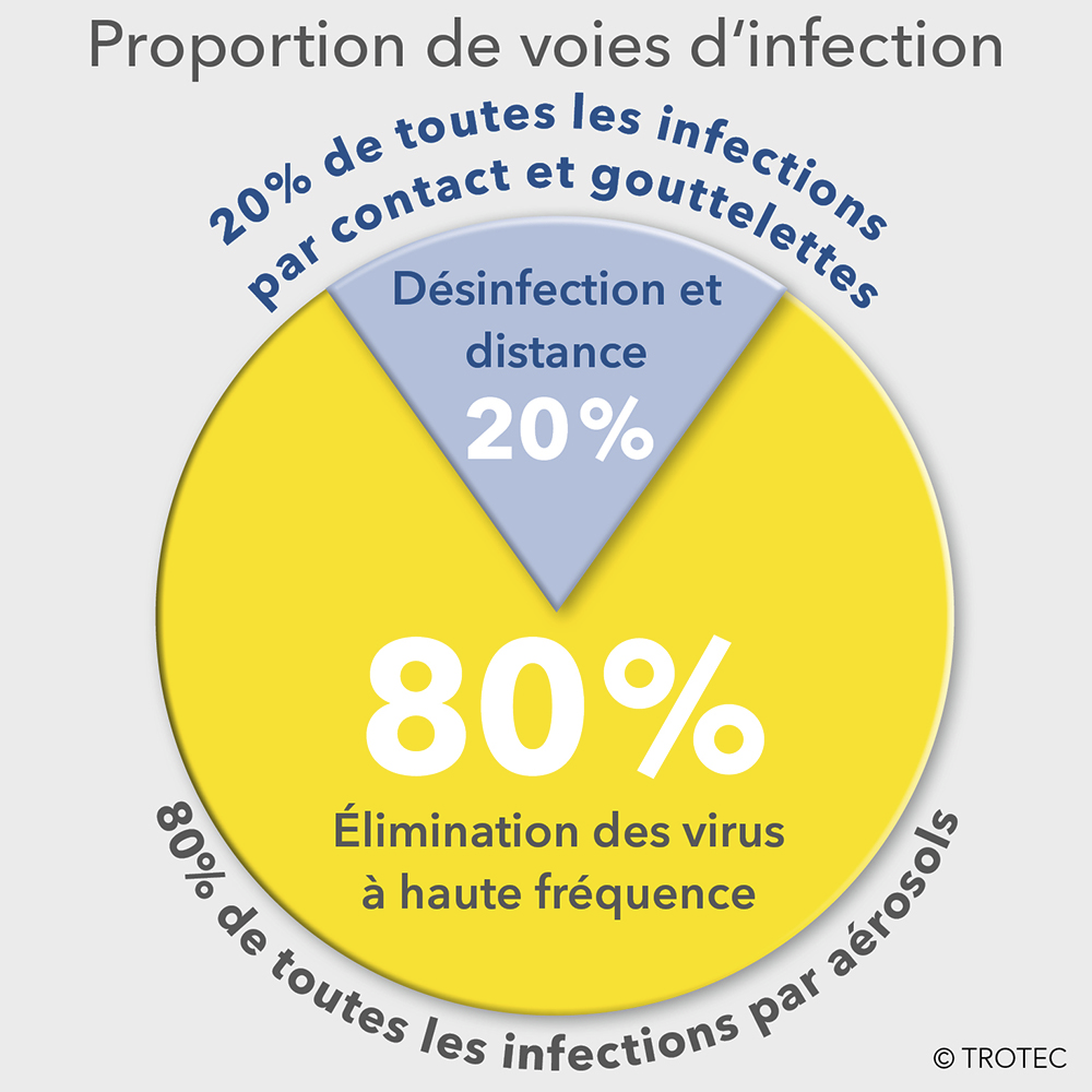 Les hygiénistes et les virologues rappellent que « toutes » les voies de transmission doivent être prises suffisamment en considération pour se protéger des infections. La propagation du virus ne peut pas être contenue si l’on se concentre uniquement sur les gouttelettes, comme cela a longtemps été le cas, ou sur les aérosols infectieux dans l’air. Des mesures d’hygiène sûres et des solutions techniques adaptées sont nécessaires afin de réduire de façon générale le risque de contamination.