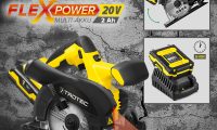 La scie circulaire manuelle sans fil PCSS 10‑20V est livrée entièrement prête à l’emploi dans une mallette rigide avec une lame de scie en métal dur à 18 dents, un chargeur rapide, une multi-batterie Flexpower 20 V 2 Ah, une butée parallèle, une clé Allen et un adaptateur pour le raccordement à un aspirateur externe.