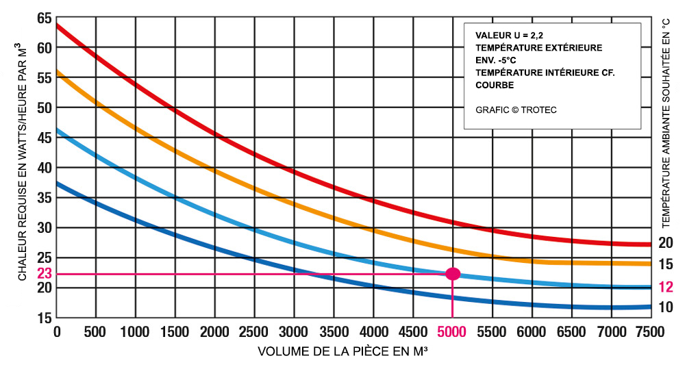 Pour un volume de pièce de 5.000 m³ avec une température extérieure moyenne de -5 °C pour 17 °C pour chauffer à une température de locaux souhaitée de 12 °C, 23 Watt par m³ sont nécessaires.