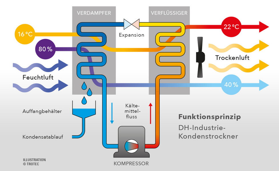 Die Industrie-Kondenstrockner der DH-Serie von Trotec sind leistungsstarke Kältetrockner, in deren Inneren eine Kompressionskälteanlage arbeitet, welche ein Kältemittel durch zwei Wärmeübertrager befördert – Verflüssiger und Verdampfer. Mittels Kompressor und Expansionsventil wird das Kältemittel in diesem geschlossenen Kreislauf wechselnden Drücken ausgesetzt, wodurch sich das Gas bei Verdichtung auf der Verflüssigerseite aufheizt und bei Entspannung via Expansionsventil auf der Verdampferseite abrupt sehr weit unter die Raumtemperatur abkühlt.