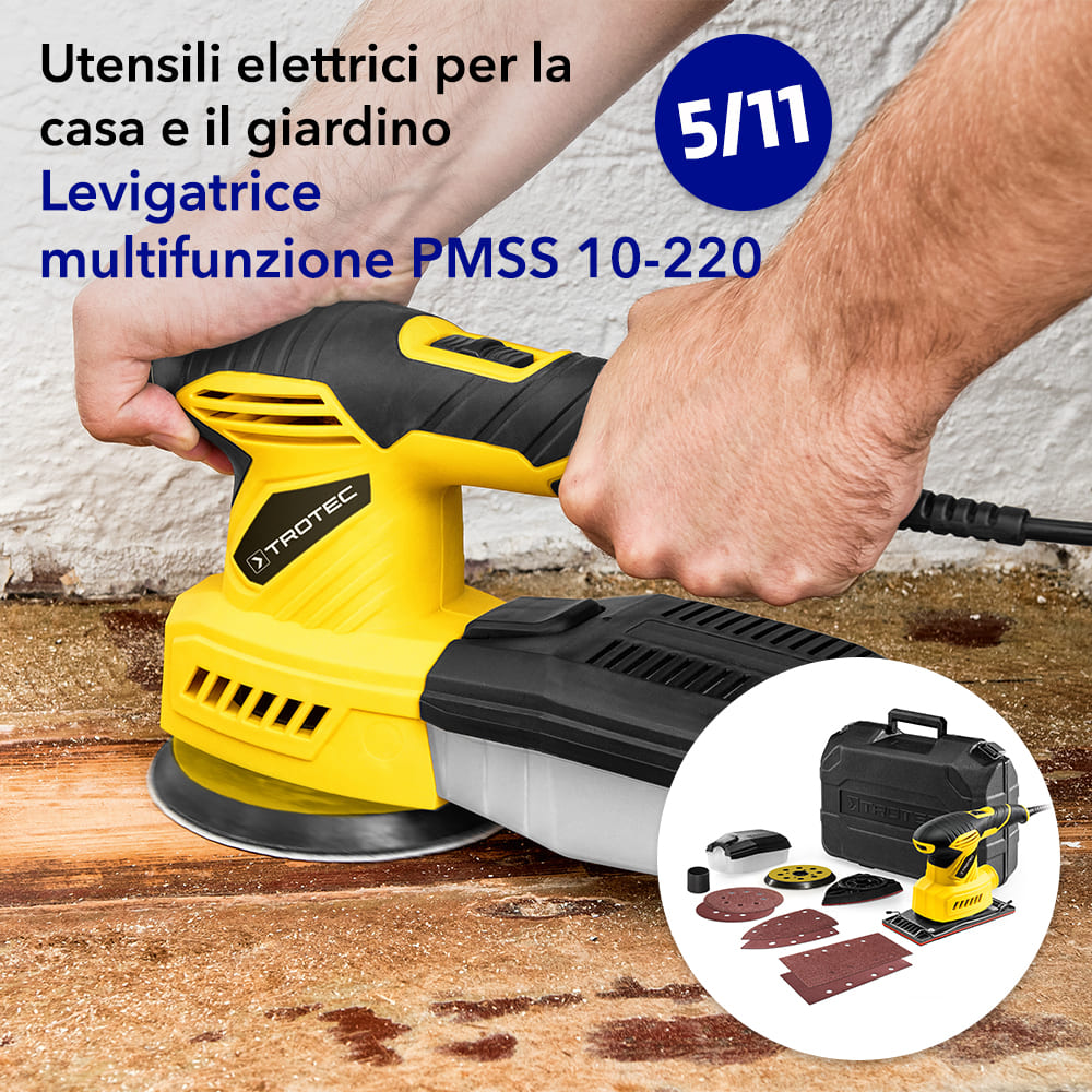 Per rimuovere vecchie mani di colori da ampie superfici è consigliabile una levigatrice oscillante. Se dovete lucidare delle superfici, invece, è meglio prendere una levigatrice eccentrica. E se desiderate levigare con precisione fino agli angoli impiegare una levigatrice a delta è sicuramente la scelta migliore. Oppure, molto più semplicemente, potete fare affidamento sulla levigatrice multifunzione 3 in 1 PMSS 10-220, tanto pratica quanto efficiente. Ha infatti ha la risposta giusta per ogni esigenza di levigatura perché bastano pochi gesti per trasformarla in una levigatrice oscillante, eccentrica o a delta perfettamente funzionante.