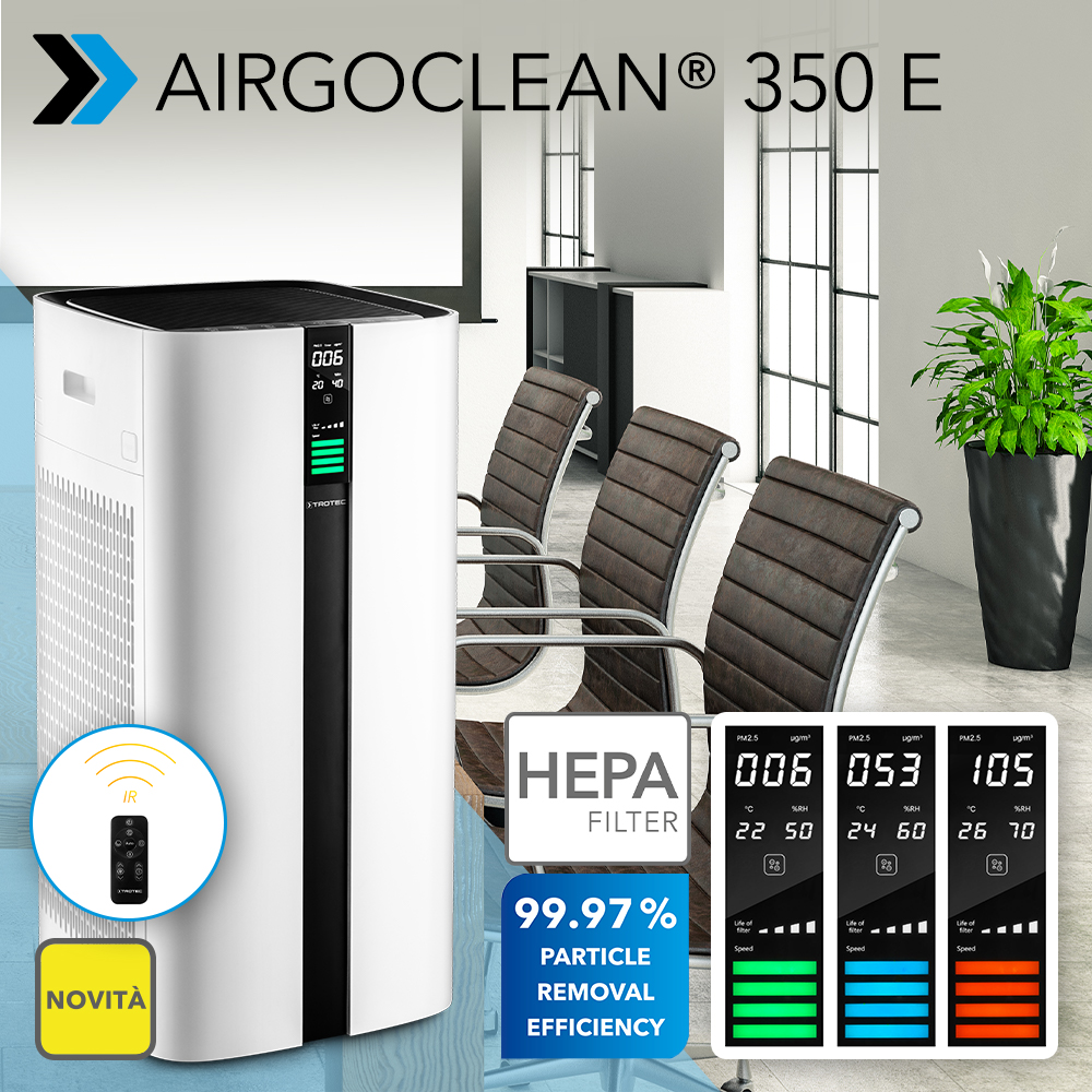 Che si tratti di Alfa, Delta o di qualsiasi altra variante in cui possa mutare questo virus insidioso: il nostro depuratore d’aria ad alte prestazioni AirgoClean® 350 E è finalmente disponibile e garantirà a voi e i vostri cari almeno in casa un’aria pulita, non contaminata da coronavirus, virus influenzali, allergeni o batteri né da spore di muffa, acari della polvere o polveri sottili. Grazie al suo filtro di protezione HEPA doppiamente efficace, il depuratore d’aria elimina il 99,97 % delle particelle ultrasottili fino a 0,3 µm – ciò avviene in modo completamente automatico grazie ai moderni “sensori Air Quality”. E anche in ufficio sarebbe quindi un perfetto e benvisto nuovo collega di lavoro …