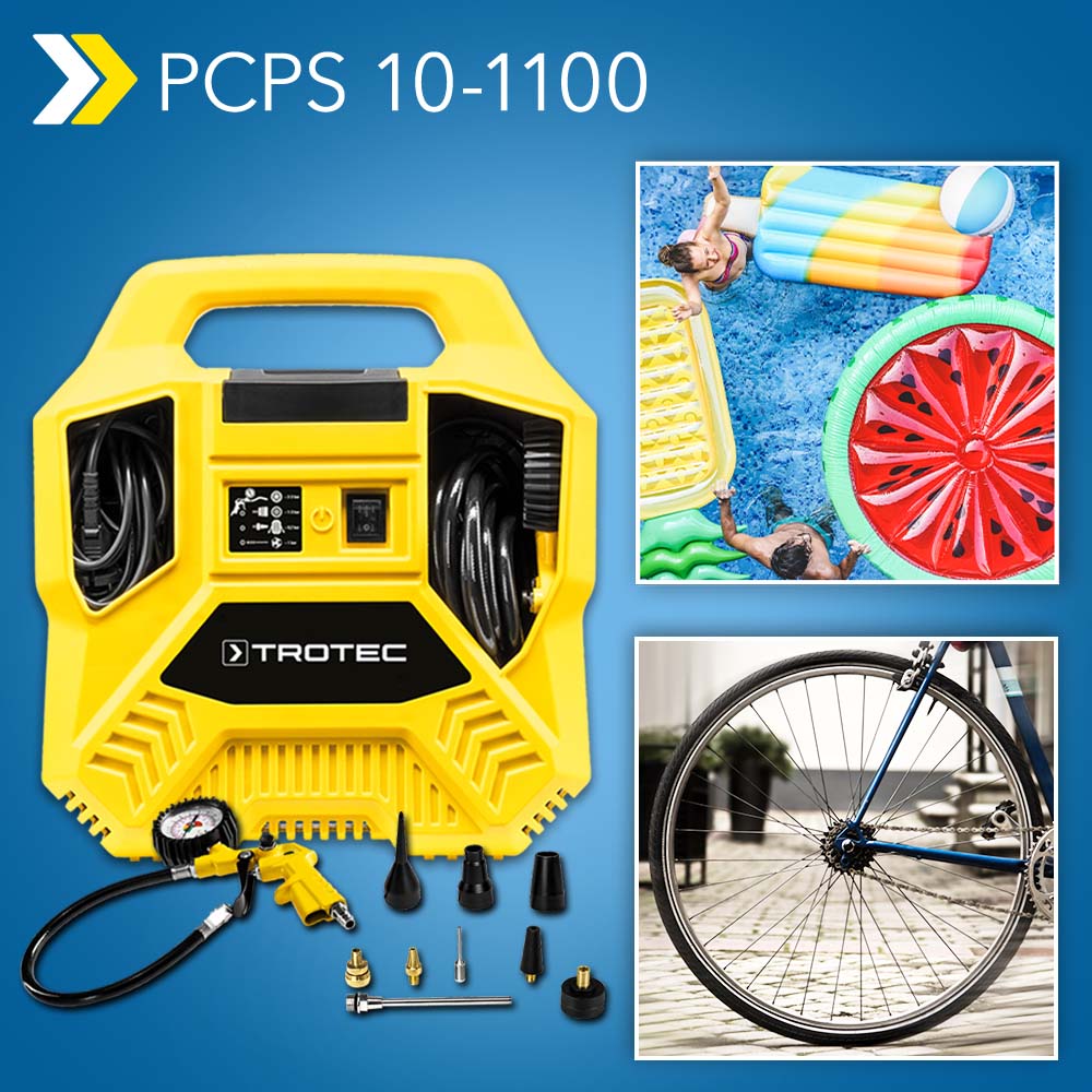 Mettere personalmente mano (o piede) alla pompa dell’aria per gonfiare pneumatici o materassini con queste ondate di calore? Neanche per sogno! Ma dall’altro lato, chi vuole rinunciare a giochi e divertimento in una giornata di sole a causa di una gomma bucata? Trotec ha la soluzione pronta in una valigetta: il potente compressore PCPS 10‑1100 fornisce infatti la giusta pressione quando si tratta di ottenere un livello di gonfiaggio ottimale. Con un motore da 1.100 watt, una pressione di esercizio fino a 8 bar e numerosi accessori, questo compressore senza olio è la soluzione domestica ideale non solo per gli pneumatici delle auto, ma anche per motociclette, biciclette, palloni, letti gonfiabili e altro ancora.