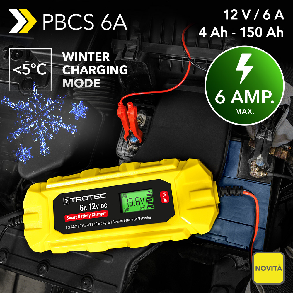 Batteria dell’auto senza corrente? Allora è sufficiente ordinare il nuovo caricabatterie PBCS 6A nel negozio Trotec. Grazie alla sua straordinaria dotazione completa, è perfettamente adatto per il mantenimento della carica da 12 volt tra 4 Ah e 150 Ah. Il caricabatterie universale controllato da microprocessore con corrente di carica di 6 ampere, ciclo di carica a 10 stadi e display LCD retroilluminato è la migliore assicurazione contro una batteria dell’auto e della moto scariche o persino del tutto esaurite, sia per la ricarica rapida sia il ricondizionamento dopo una scarica completa ma anche per conservare tutte le impostazioni quando si cambia la batteria.