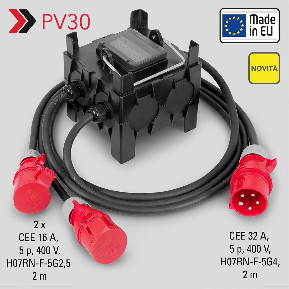 Nei cantieri, la comune combinazione di prese fisse sporgenti nonché il semplice distributore di corrente dispongono soltanto di un’ulteriore presa 16‑A CEE, oltre ad una presa 32 A CEE. Come fare quindi per azionare più apparecchi a corrente trifase 16‑A? Sarebbe l’ideale avere tra la propria attrezzatura il nuovo robusto distributore portatile in plastica PV30: questo professionista della distribuzione di corrente industriale, infatti, è dotato di una spina 32 A e due accoppiamenti 16‑A. Una soluzione subito pronta all’uso, comprensiva di tre cavi di collegamento integrati di due metri di lunghezza ciascuno! Ed esclusivamente da Trotec!