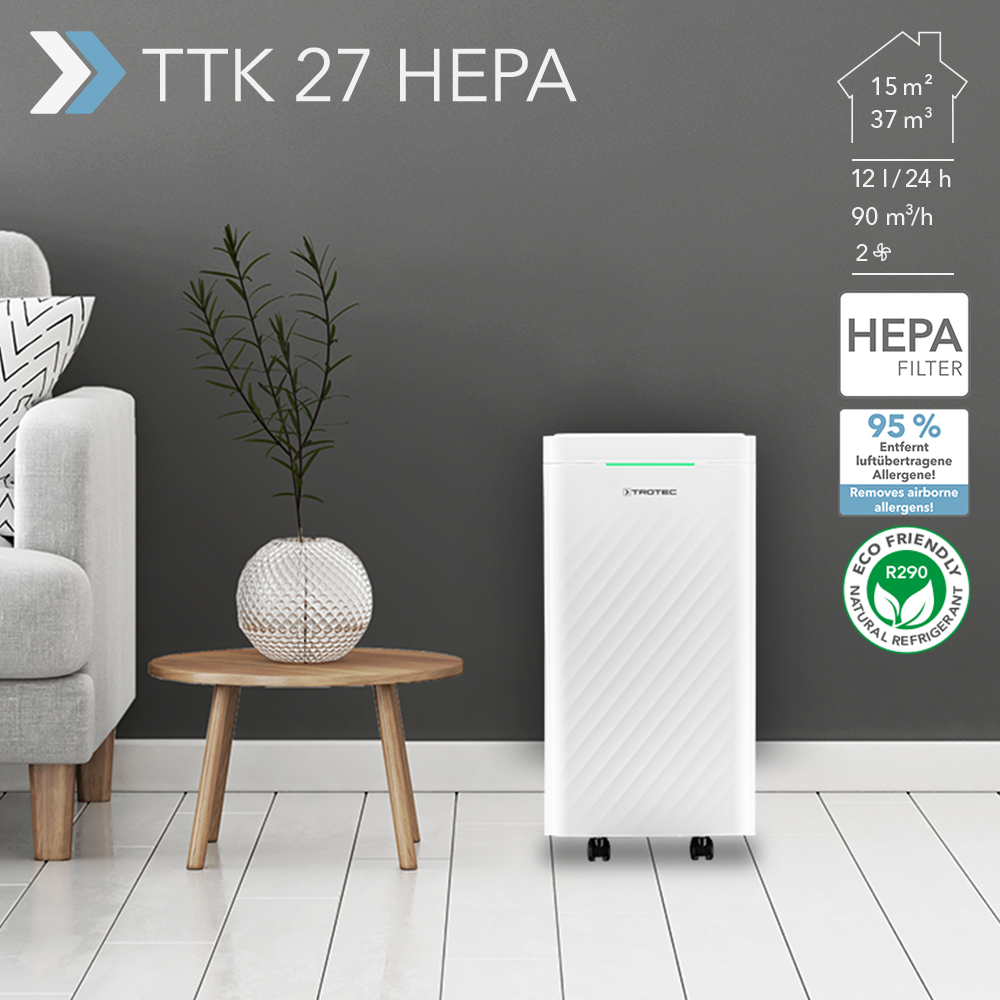 Mentre gli esperti di salute continuano a mettere in guardia sui rischi della muffa derivanti dall’eccessiva umidità interna, il prossimo allarme sta già suonando: i pollini sono di nuovo in giro! Un inquinamento atmosferico pericoloso non solo per chi soffre di allergie e per gli asmatici, ma per tutti coloro che soffrono di malattie respiratorie. È quindi positivo che il deumidificatore di design e depuratore d’aria TTK 64 HEPA sia di nuovo disponibile in tempo utile: Un deumidificatore d’aria da 24 l e un purificatore d’aria HEPA funzionano in un unico dispositivo, che rimuove fino al 95% delle spore di muffe patogene e del polline, nonché altri inquinanti dall’aria ambiente. Respirate a pieni polmoni!