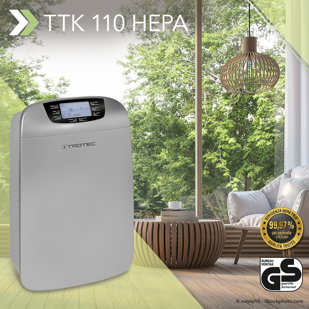 Spesso le stanze umide e bagnate generano in poco tempo due problemi: un livello troppo elevato di umidità dell’aria e aria insalubre. Qui entra in gioco il TTK 110 HEPA nuovamente disponibile con la sua combinazione unica di deumidificazione e depurazione dell’aria. Lo specialista dell’aria asciuga le stanze umide e migliora sensibilmente l’aria ambiente grazie al suo filtro HEPA: in 8 ore l’apparecchio libera l’aria ambiente da virus, batteri e impurità dannosi per la salute.