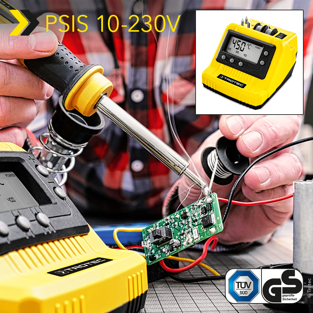 Ecco quello che stavate tutti aspettando: la stazione di saldatura PSIS 11-230V, finalmente disponibile – una pratica tuttofare per operazioni di saldatura dolce precise e a temperatura controllata. Grazie ai suoi potenti 48 watt garantisce infatti temperature di lavoro costanti comprese tra i 150 e i 500 °C. È quindi l’ideale per praticamente tutti gli impieghi nel settore dell’elettronica, della modellistica e dell’artigianato: che si tratti di saldare o dissaldare in modo affidabile condensatori, resistori e transistor su componenti elettronici, collegare cavi e fili in lavori di modellismo oppure unire fini elementi in vetro con la tecnica Tiffany.