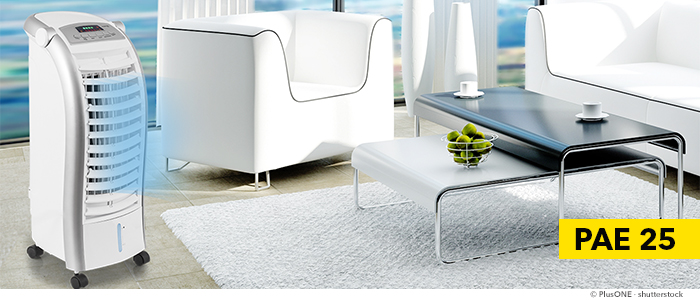 Prima che torni il caldo insopportabile in ufficio e a casa nei prossimi mesi, potete procurarvi un dispositivo che assicuri freschezza ed eleganza per i vostri ambienti grazie al nuovo Aircooler PAE 12 che funziona in modo totalmente naturale e senza refrigeranti chimici. Questo rinfrescatore d’aria può essere utilizzato anche senza funzione di raffreddamento attivata come ventilatore completo. E come se non bastasse, d’autunno e d’inverno svolge una funzione altrettanto indispensabile, contrastando come umidificatore l’aria secca prodotta dai sistemi di riscaldamento. È bene sapere che un aumento del livello di umidità al 50% riduce i rischi di infezione tramite virus e germi nell’aria ambiente!