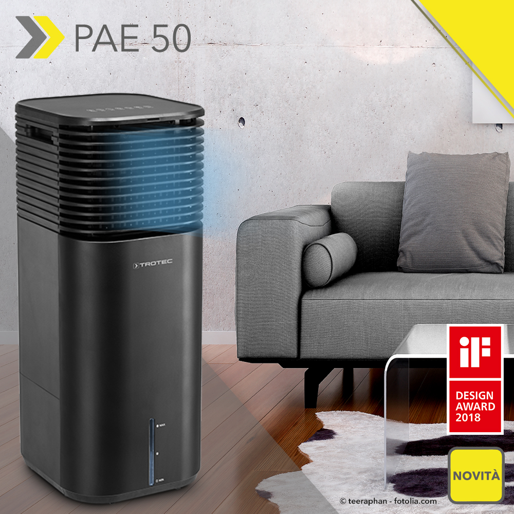 Il nuovo Aircooler PAE 50 di Trotec è il vincitore dell’IF Design Award 2018. Questo ambito premio di design si è affermato in tutto il mondo come uno dei riconoscimenti più prestigiosi e viene assegnato alle realizzazioni più sofisticate. La bellezza delle linee e l’alloggiamento in nero opaco conferiscono al rinfrescatore d’aria 4 in 1 una forte presenza espressiva. L’Aircooler tuttavia non è vincente solo grazie al suo design premiato, ma stupisce anche in quanto a funzioni e prestazioni.