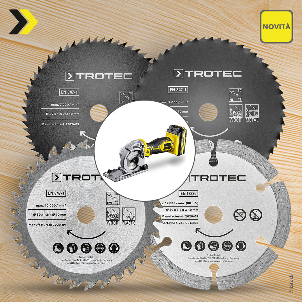 Con i nuovi set di lame per mini sega circolare a mano Trotec nella pratica confezione convenienza avrete sempre a portata di mano la lama perfetta per quasi tutti i materiali e per tutte le esigenze. E questo non solo per la mini sega circolare a mano a batteria PCSS 05‑20V compatta di Trotec, ma per tutte le mini seghe a immersione standard. Che si tratti di lavori in casa, di hobby o di interventi professionali: sono tante le possibilità di utilizzo di una mini sega circolare a mano. Tuttavia non tutte le lame per seghe circolari garantiscono risultati sempre ottimali con ogni materiale.