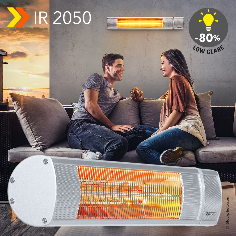 Temperature estive in terrazza anche nelle fresche ore serali e, perché no, persino tutto l’anno? Utilizzando come potente fonte di calore la stufetta a raggi infrarossi dal design in alluminio IR 2050, finalmente di nuovo disponibile, potete estendere a 365 giorni l’anno il “tempo all’aperto” sul balcone, in terrazza o anche negli ambienti esterni del settore della gastronomia – attivabile facilmente e con la massima comodità grazie al telecomando fornito in dotazione. Oltretutto, la tecnologia Low Glare che riduce la luminosità crea un’accogliente atmosfera a lume di candela. Appena fuori casa!