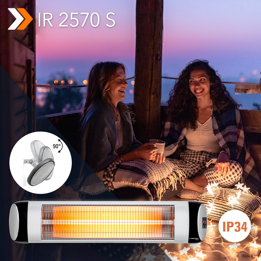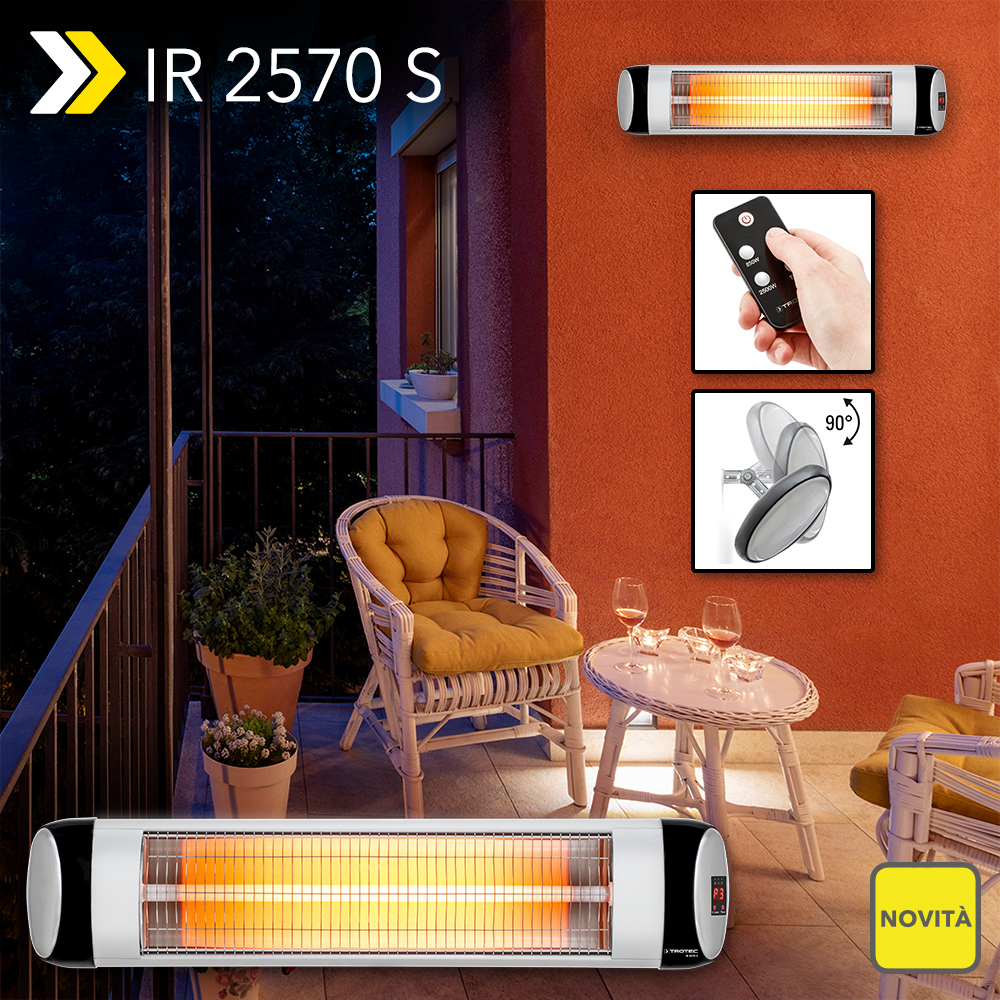 Chi è che dice che non si può utilizzare la terrazza o il balcone come oasi di benessere anche nelle ore serali più fresche? E neanche come estensione del salotto per tutto l’anno? Basta premere un pulsante e la nuova stufetta a raggi infrarossi IR 2570 S produce un piacevole tepore immediato con i suoi 2.500 watt. E grazie all’angolo di inclinazione regolabile di 90° crea una gradevole temperatura per i posti a sedere negli ambienti esterni scoperti, anche nel settore della gastronomia. A completare la dotazione comfort della stufetta a raggi infrarossi ci sono il telecomando e la funzione timer. Per fare solo due esempi!