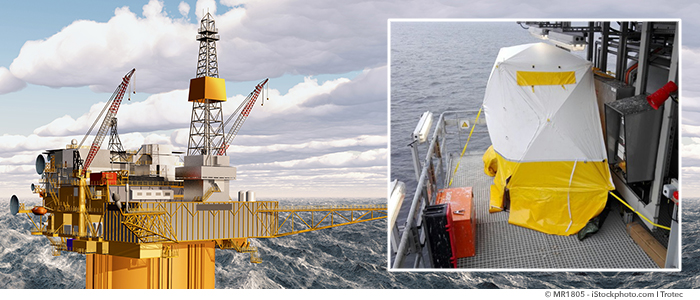 La gamma di tende da montaggio Trotec comprende anche alcune attrezzature speciali utili in caso di tempesta. Originariamente concepite per i lavori di saldatura, hanno dato buona prova anche nell’impiego offshore sulle piattaforme petrolifere. Recentemente la nostra tenda da lavoro 250 x 180 KE ha prestato un ottimo servizio durante i lavori di manutenzione su due armadi per pompe diesel.