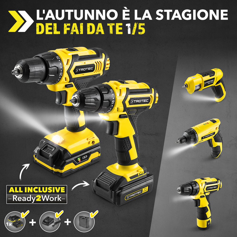 Per gli appassionati di bricolage la stagione autunnale rappresenta un’ottima occasione per dedicarsi a lavoretti domestici di abbellimento e riparazione. Tutti questi interventi possono essere sbrigati molto più agilmente servendosi di attrezzi elettrici professionali. Per lanciare la nostra serie in cinque puntate “Insieme all’autunno inizia la stagione del bricolage” vi consigliamo i nostri avvitatori e trapani avvitatori a batteria di qualità del marchio Trotec – apparecchi ad alte prestazioni dal prezzo imbattibile. Perché la qualità non ha prezzo.