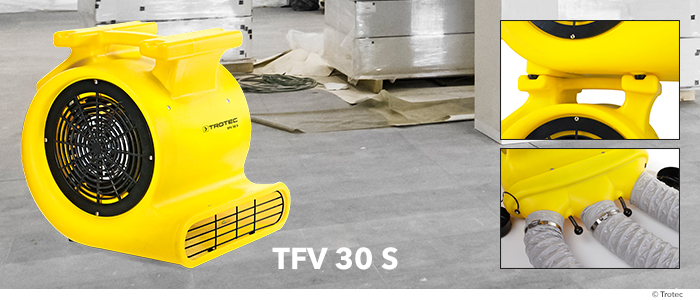 Oltre ai due attuali ventilatori turbo TFV 10 e TFV 30, arriva anche la nuova classe con il TFV 20. Con una potenza d’aria massima di 1.185 m³/h, detta nuovi parametri per l’aerazione a scopo di essiccazione. Il TFV 20 è una soluzione straordinariamente efficace per la circolazione di grossi volumi d’aria nell’ambito di numerosi impieghi professionali. Questo ventilatore radiale disponibile in esclusiva da Trotec non si distingue solo per il design industriale tedesco orientato alla pratica, ma soprattutto per le sue prestazioni e la sua durata.